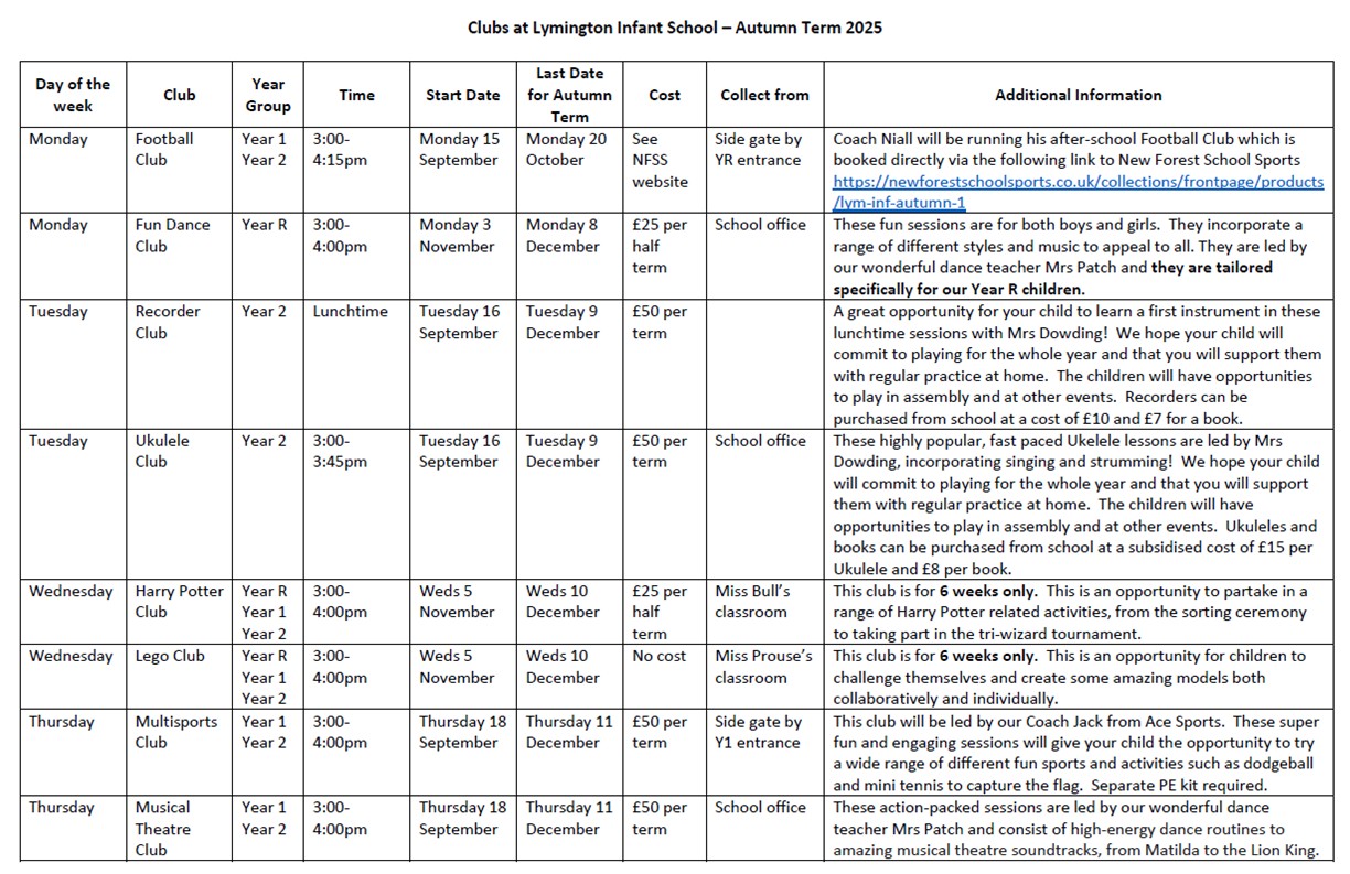 We are pleased to be able to offer a selection of after school clubs for the Autumn term 2025.