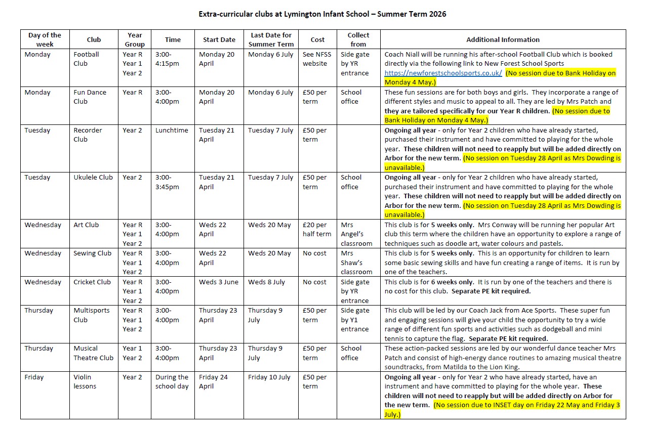 We are pleased to be able to offer a selection of after school clubs for the Summer term 2026.